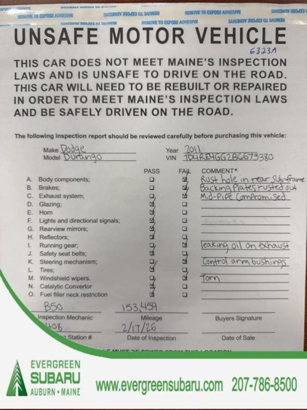 "AS-IS" WHOLESALE TO THE PUBLIC! This Dodge Durango does NOT include a Maine state inspection sticker, you have to TOW IT off the lot! Buy like the dealers buy! This Durango was driven here and traded-in and we have decided to sell it as it sits! A great chance to get a great vehicle at a low price! COME TAKE A LOOK TODAY! CHECK OUT OUR COMPLETE INVENTORY HERE https://www.evergreensubaru.com/cheap-used-cars.htm.