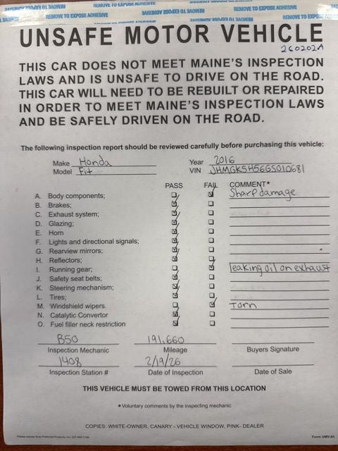 "AS-IS" WHOLESALE TO THE PUBLIC! This Honda Fit does NOT include a Maine state inspection sticker, you have to TOW IT off the lot! Buy like the dealers buy! This Fit was driven here and traded-in and we have decided to sell it as it sits! A great chance to get a great vehicle at a low price! COME TAKE A LOOK TODAY! CHECK OUT OUR COMPLETE INVENTORY HERE https://www.evergreensubaru.com/cheap-used-cars.htm.